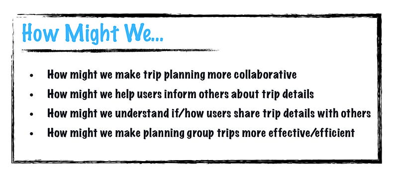 This method is very trendy in the UX world, and for a good reason. ‘How Might We’ statements allow us to reframe our insights and thoughts into a broader context. We use these types of statements because they can get us thinking about the problem from many different angles, and they open the door to creativity. They also ensure we are thinking about an actual user need versus just coming up with cool ideas. Let’s take the sharing example and recontextualize it with HMW statements: