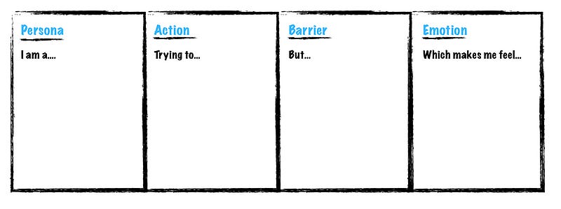I am (persona/role) trying to (do X) but (barrier/problem) because (x), which makes me feel (emotion)