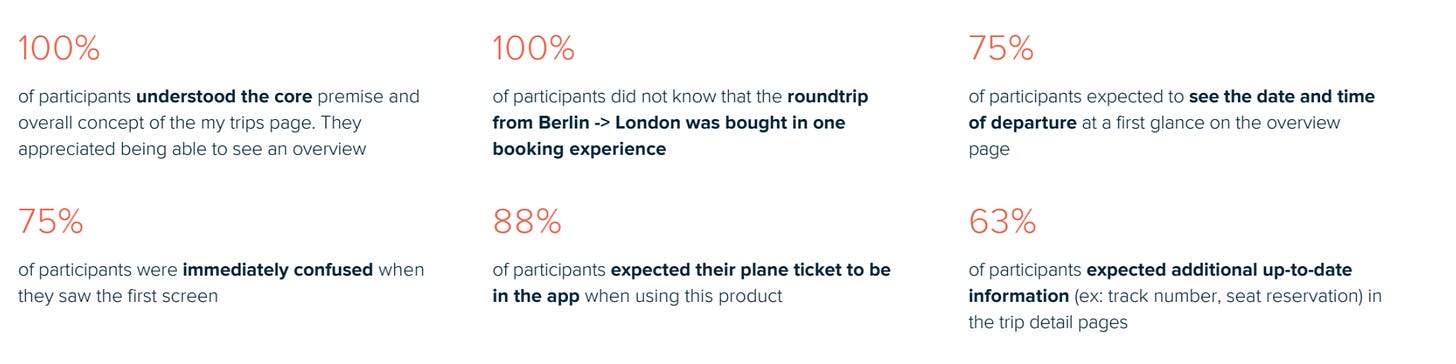 Just like quite a few stakeholders mentioned in the interviews, a list of facts isn’t particularly actionable. I really struggled with writing insights (check out this article for a very in-depth explanation of writing impactful insights) for a long time because I didn’t really understand what the buzzword actionable meant when it came to insights.