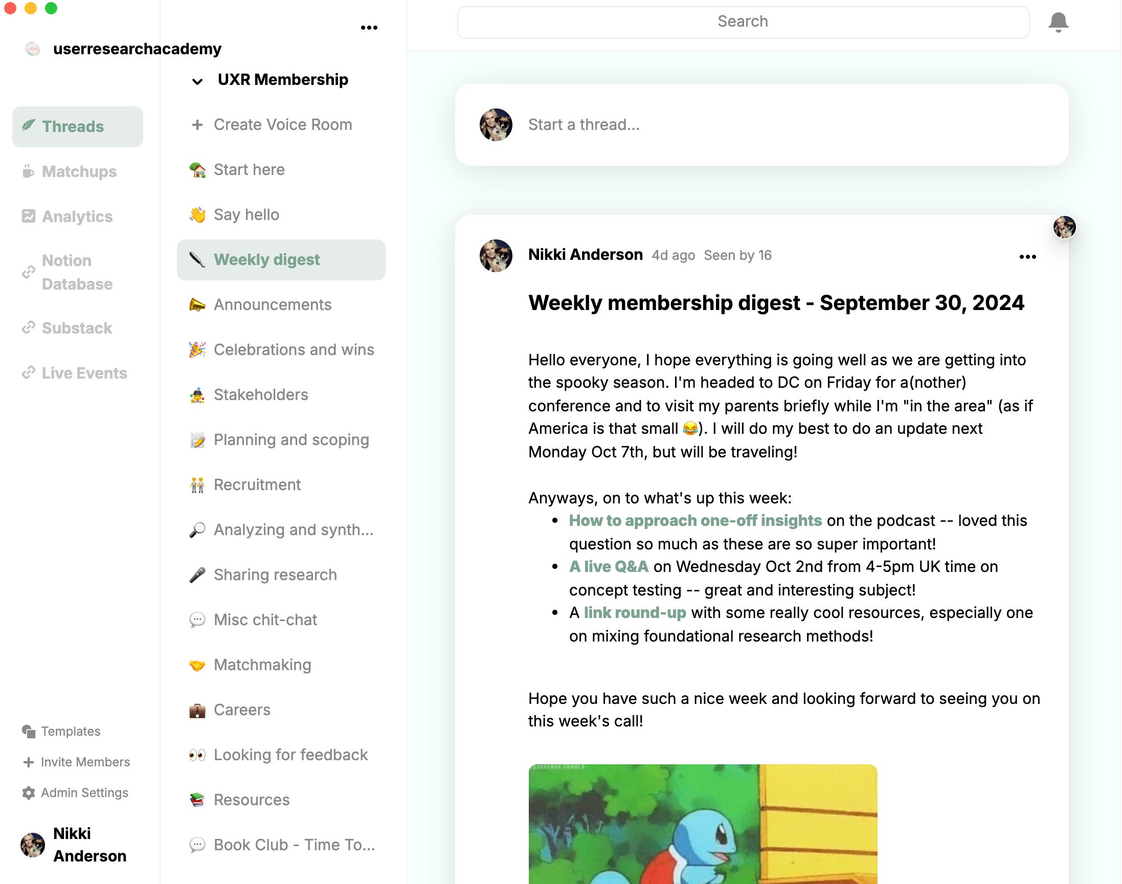 All User Research Academy paid subscribers now get access to a paid subscriber-only community—a place to ask questions, share stories, and get input from me (I’m in the community every day). This is a safe space for you to share and connect with other user researchers in a very unique way.