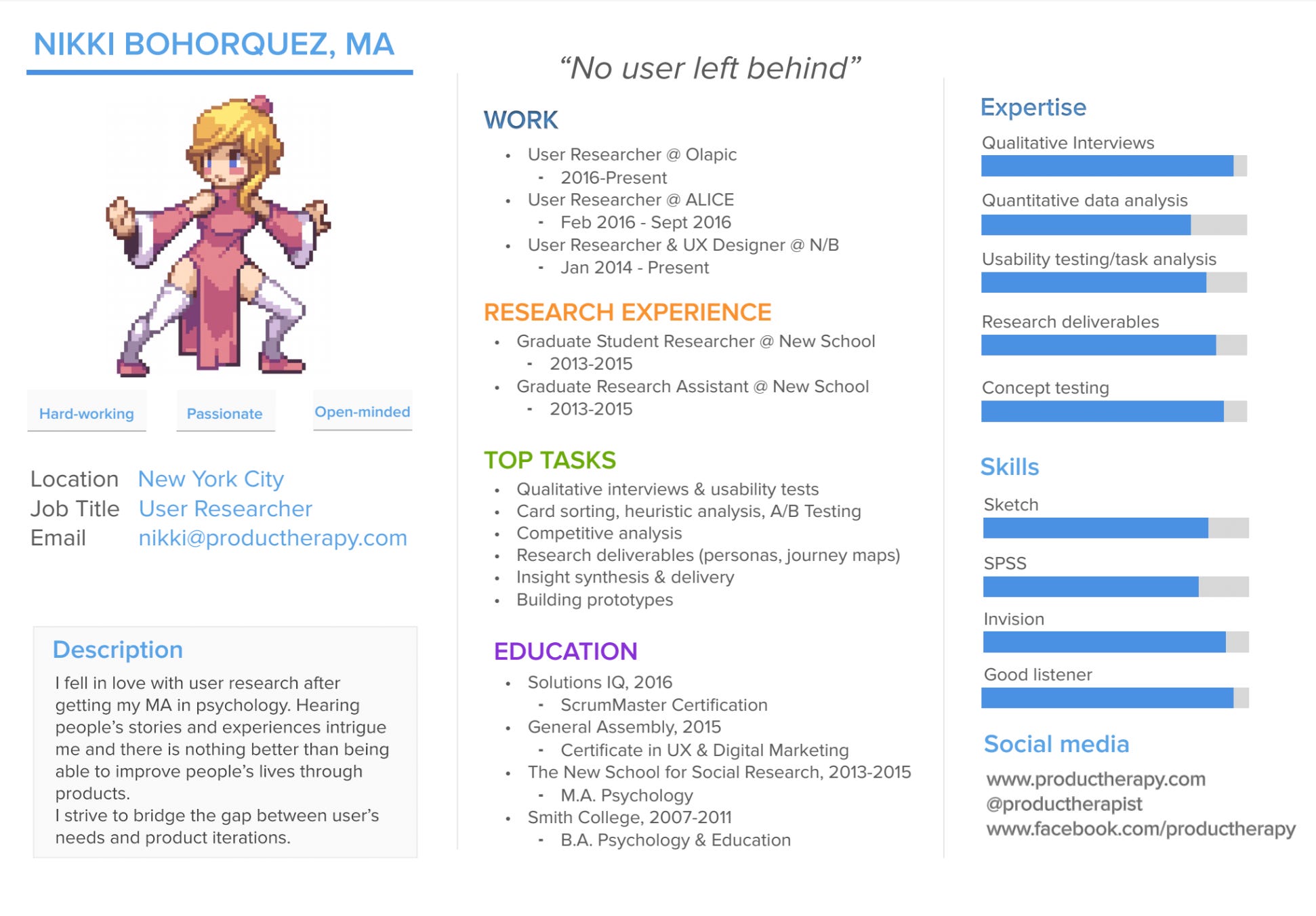 I struggled with this so much when I was applying for user research jobs. I knew that there were certain things I had to put on my resume, but I also wanted to show my uniqueness. ButâŚwas I actually unique? As a user researcher, I didnât feel like I had anything new or interesting to say. I put what I saw in every other resume that I scoured on the internet.