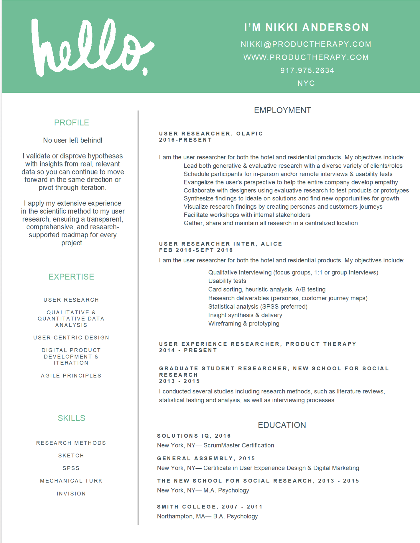 Well, first, I have a huge glaring mistakeâŚsee if you can spot itâŚI use the same âI am the user research for both the hotel and residential productsâŚâ for two roles. LOL. Whoops. ALWAYS check your spelling and grammar, and that everything is in the right place. I see so many small mistakes on resumes, and, as a hiring manager, it makes me cringe.