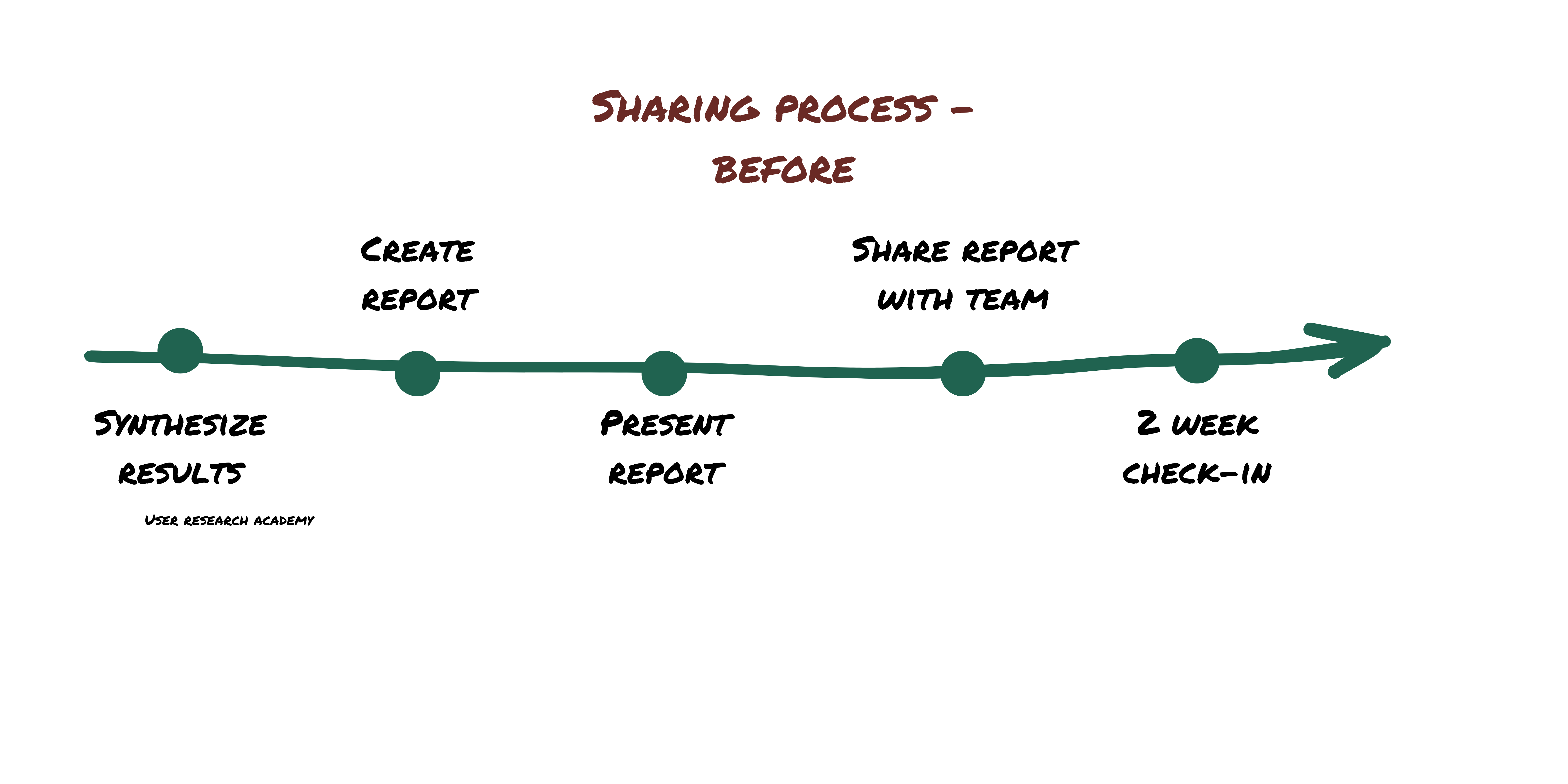 One of the biggest pain points I identified in my sharing process was that teams were unsure of how to take big insights and bring them from the problem to the solution space. My biggest shift was understanding that I was missing this huge part of the research process. I went straight from presenting the research to checking in and seeing what teams were doing with it.