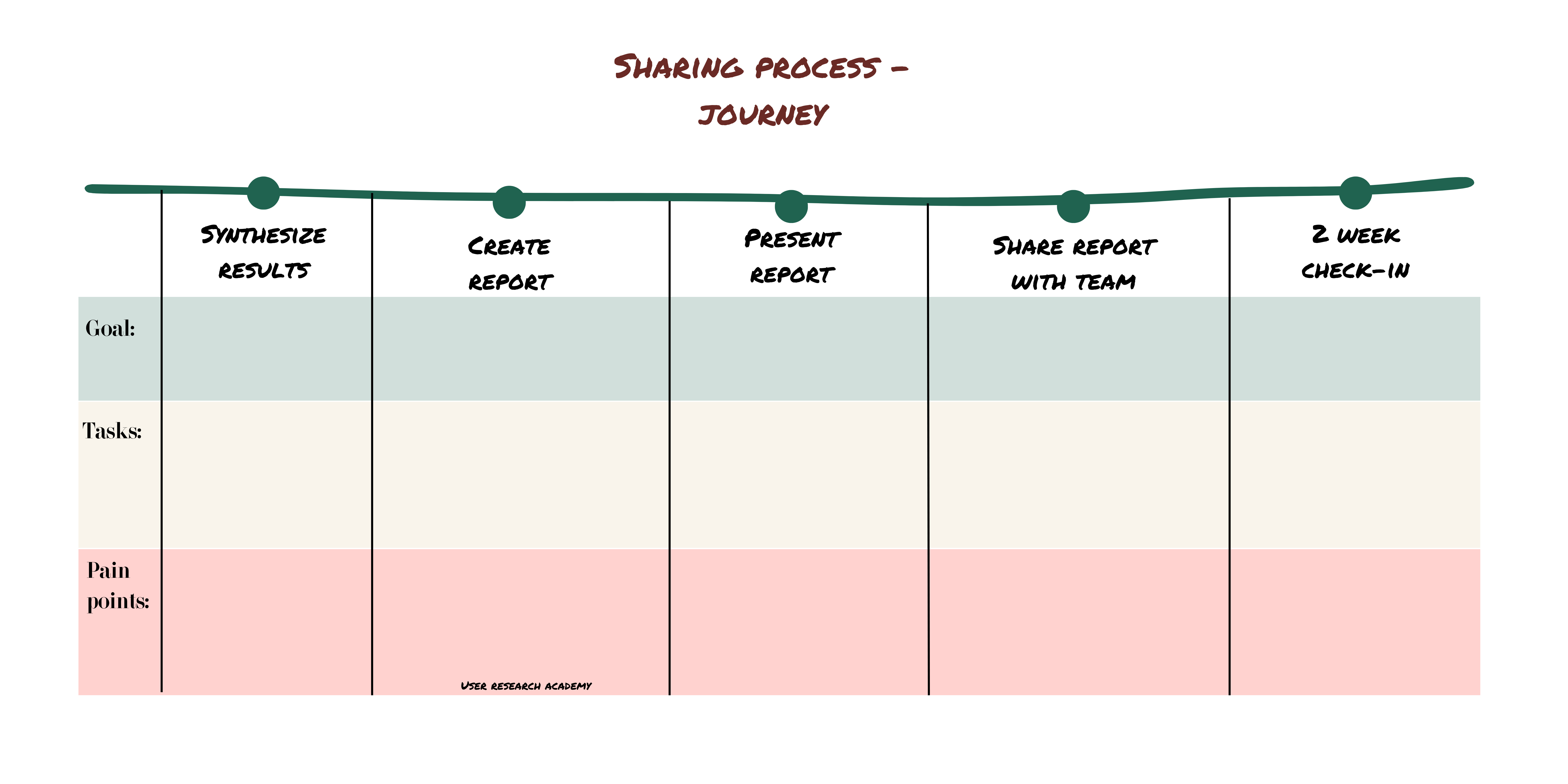 When going through this exercise, make sure you are specific with your pain points. Don’t just write that things take a long time; try to tease out exactly what is taking a long time, just like you would do with a participant. Be your own research advocate!