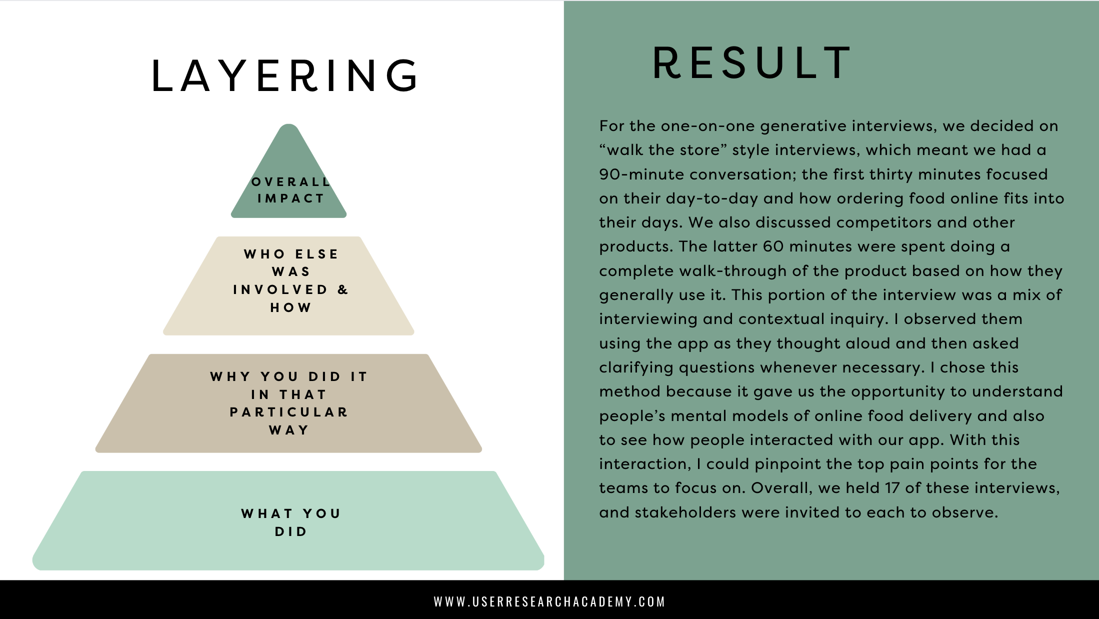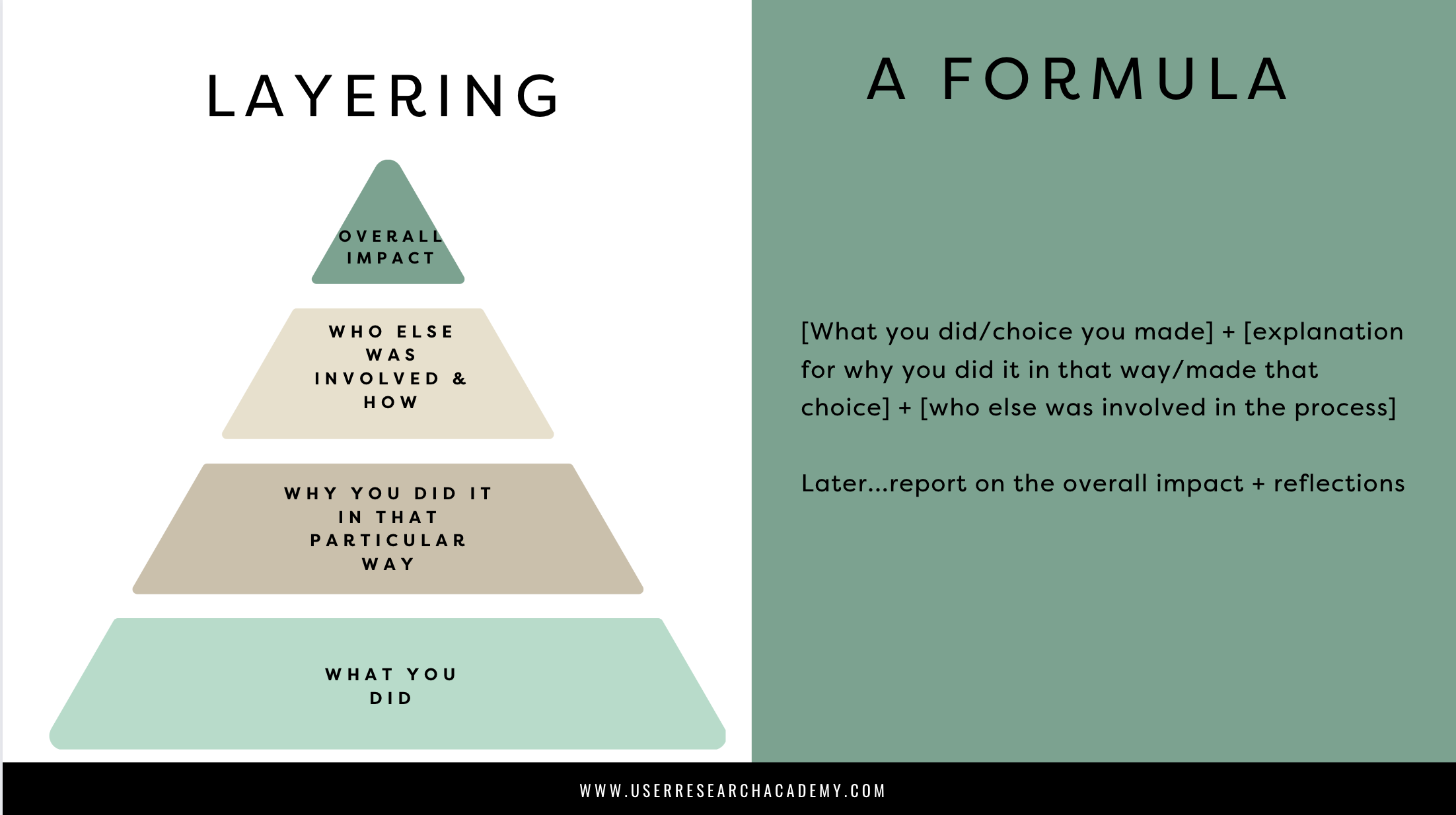 Missing some sort of impact. As I mentioned, your impact as a user researcher doesnât have to be tied to a product or the product team. We arenât the chef, but an ingredient in the pie â if someone decides to leave something out, we have no control over the outcome. Talk through different types of impact, such as teaching the team, experimenting with a new intake document, running a different type of workshop, increasing the speed of your recruitment, or finding a new tool â thereâs a world of impact out there!