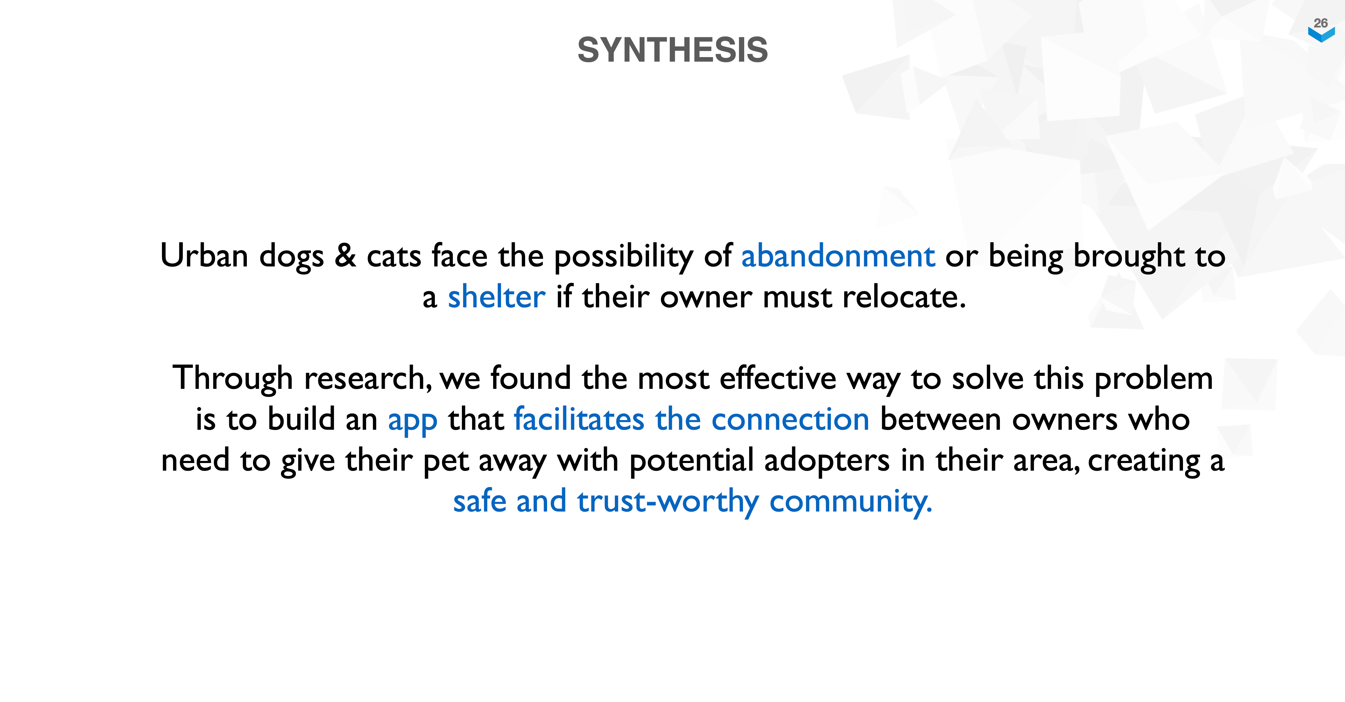 Analysis and synthesis process. This is the part that most people skip and is shrouded in mystery. Somehow we go into a methodology, et voilĂ , we have insights! Since this is such an integral part of the research process, it is critical to talk through how you analyze and synthesize raw data into something useful and valuable to your team. What types of techniques and processes did you use? Did you debrief after each of the sessions? Why/why not? Who else was a part of the synthesis process? Include examples and screenshots, even if that means you have to blur out sensitive information!
