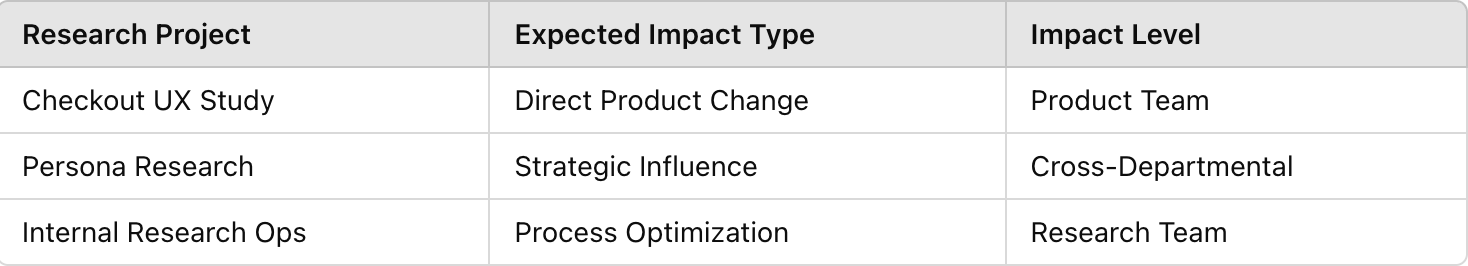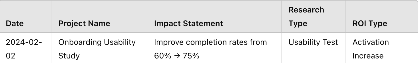 Once you’ve defined the goal, immediately document it in your UXR Impact Tracker. This ensures the research is tied to a tangible outcome from the start.
