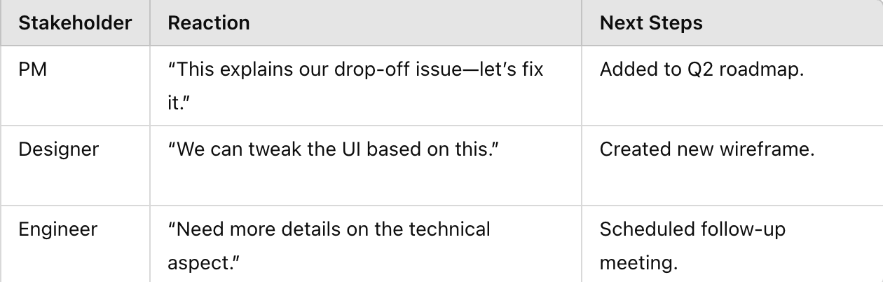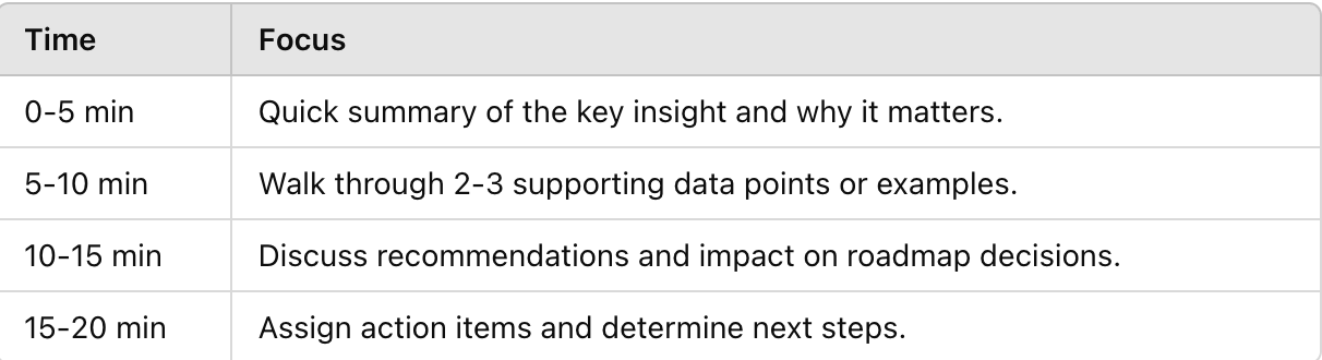 Instead, schedule a research readout or discussion session where you can walk stakeholders through the insights and ensure they understand them.