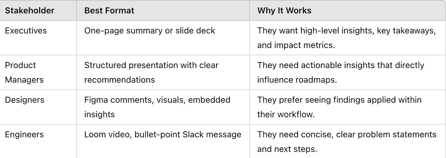 Different stakeholders consume information in different ways. If you want your research to be actionable, present it in a format they will actually engage with.