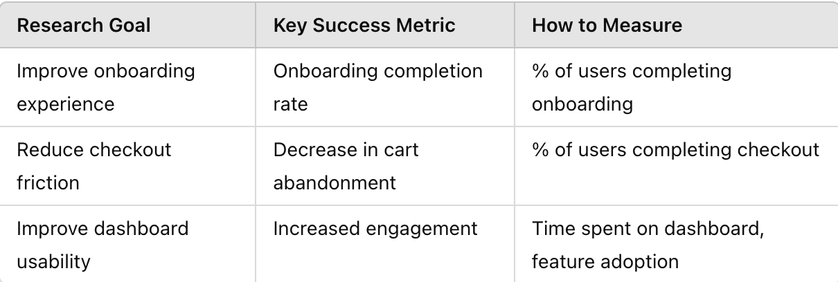 Good Research Goal: “Identify usability barriers in onboarding that prevent users from completing the setup process. Success will be measured by an increase in onboarding completion from 60% to 75% within 3 months of implementation.” (Clear and measurable!)