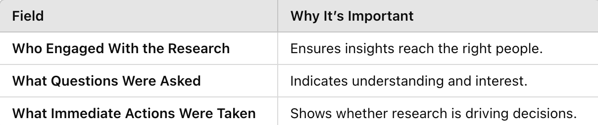 Most research impact doesn’t happen overnight. Stakeholders may agree with your findings, but implementation takes time. Without a structured follow-up process, research can get lost in the shuffle.