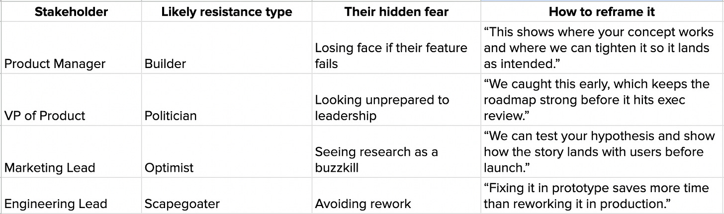 You’ll walk into the meeting already knowing who’s likely to bristle, what they’re afraid of, and what tone will calm them down. You’re preparing for the reality that research is political. The Resistance Map gives you control before the conversation starts.