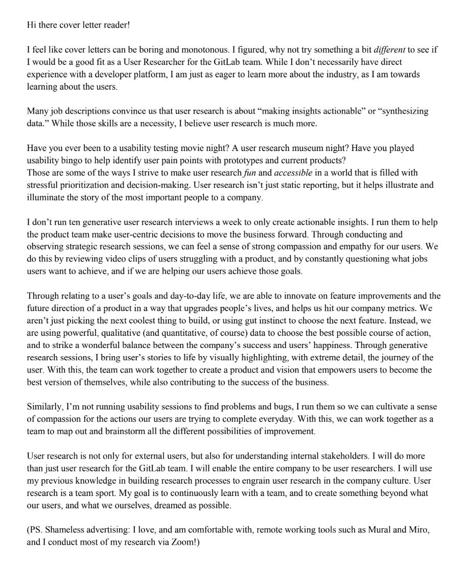 User research is about storytelling and personalizing actionable information for your teams. If I canât demonstrate at least some of those skills in a cover letter, thatâs not a good sign for any hiring manager.